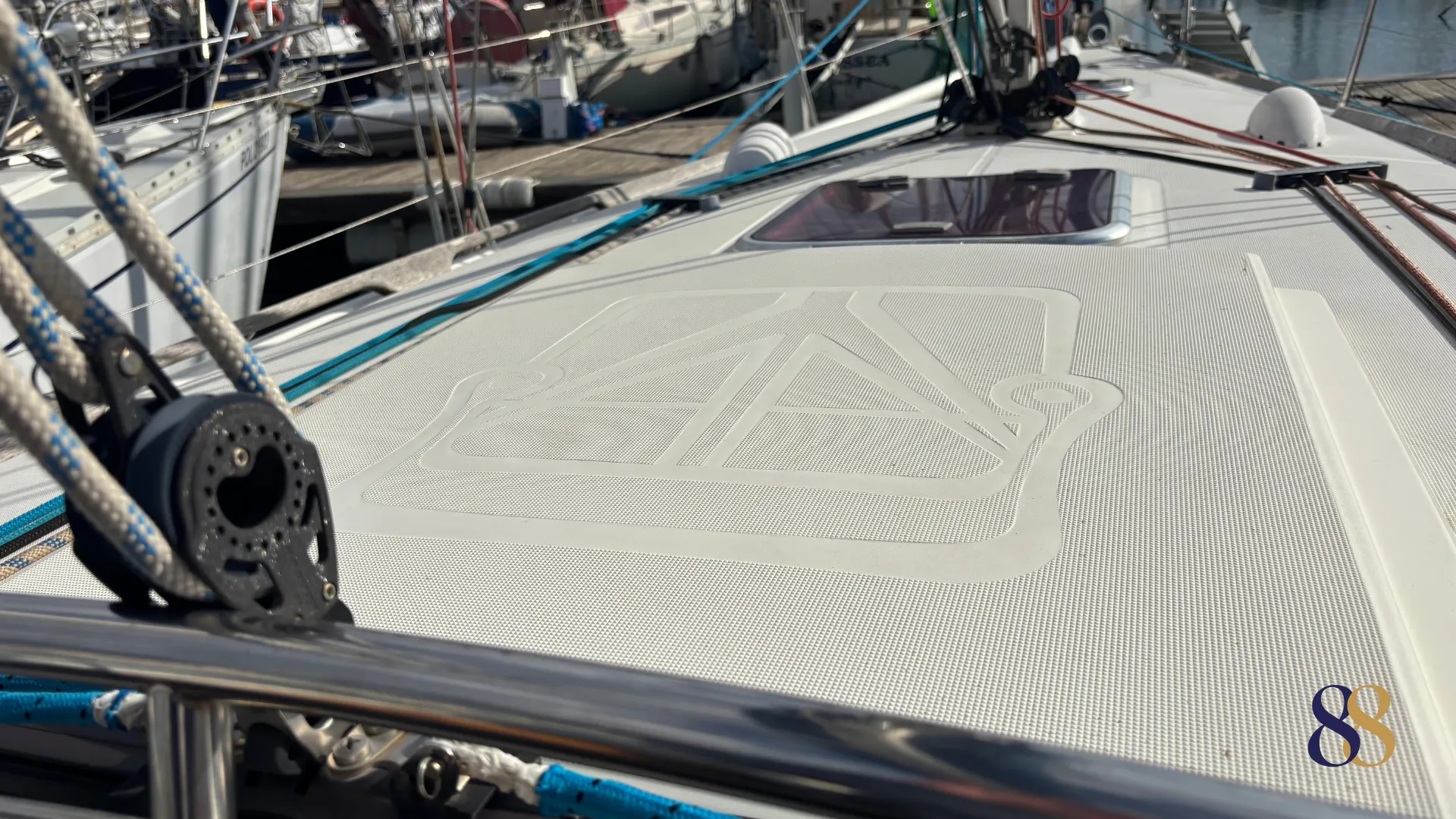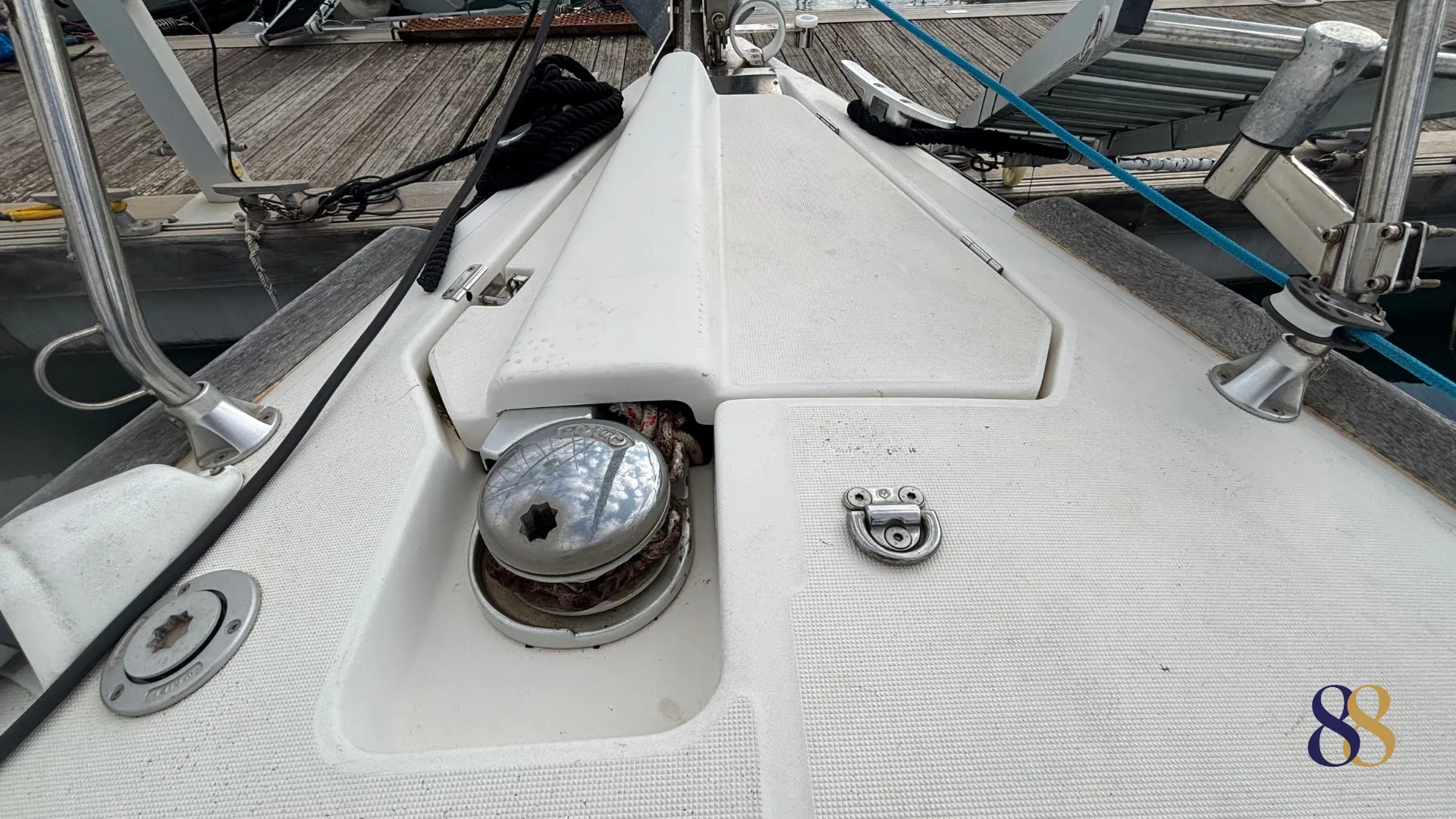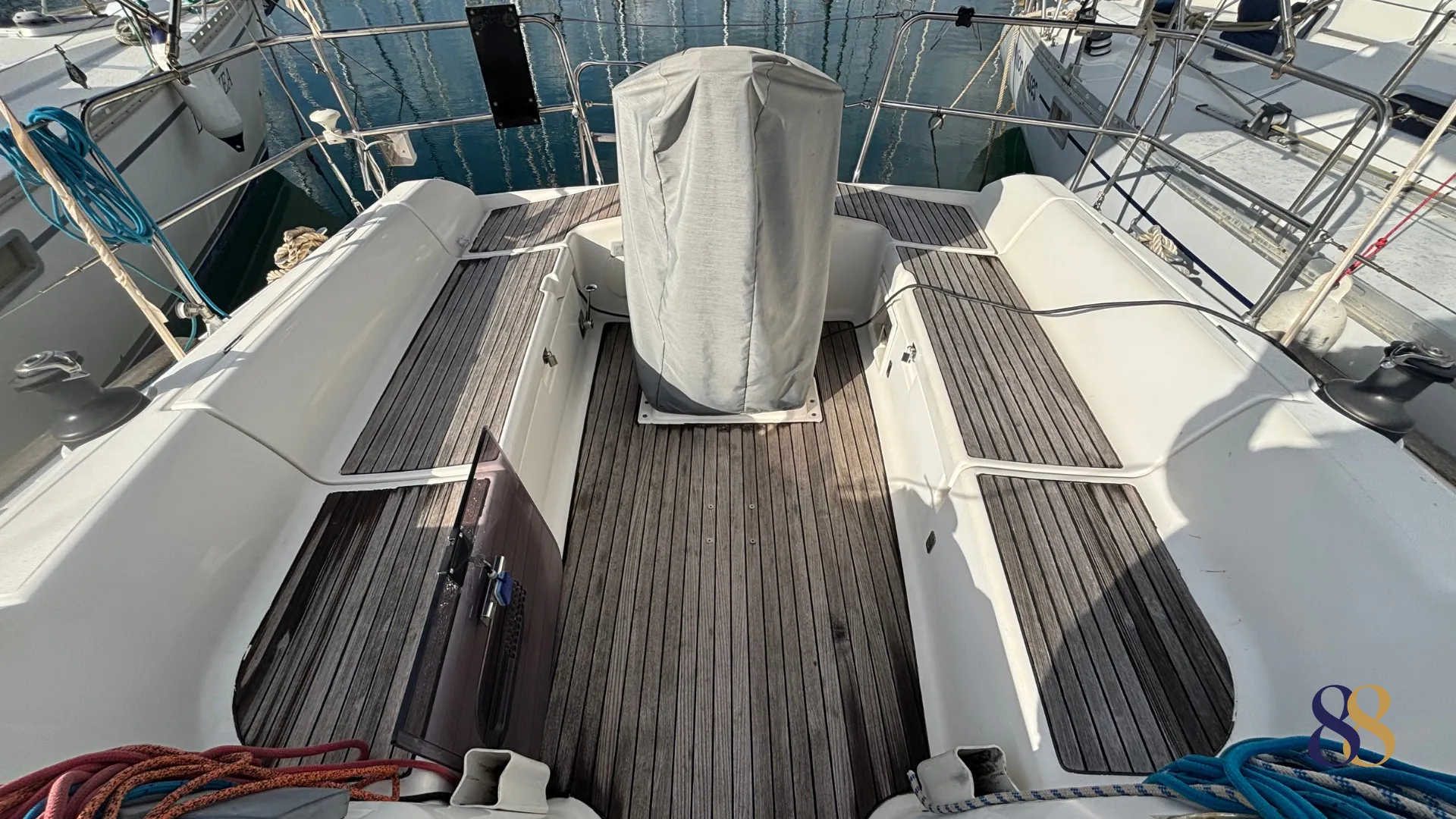 Ducha en popa, teca en bañera y escalera de baño para disfrutar tras cada chapuzón. Altavoces exteriores para ambientar, bimini para sombra y pasarela para embarcar con seguridad. Velas enfocadas a la practicidad: mayor con lazy bag, génova enrollable y asimétrico con tangón.