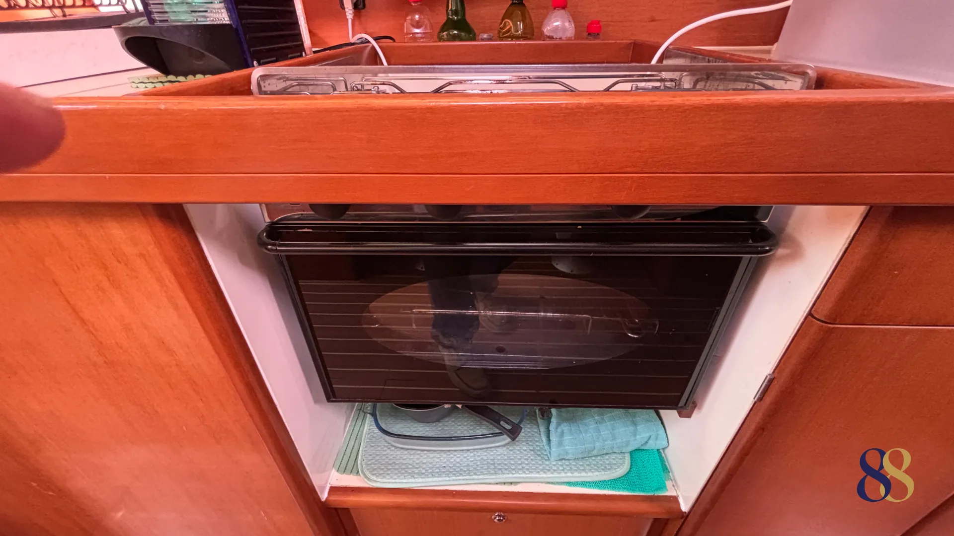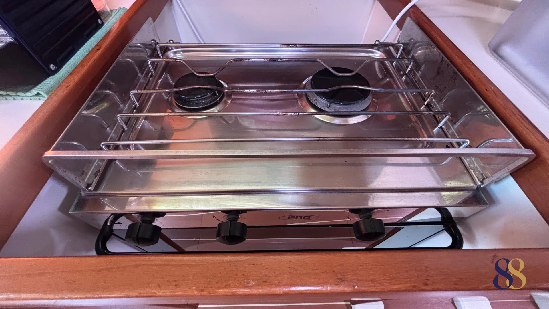 La cocina a gas de dos fuegos, horno y nevera eléctrica permiten disfrutar de estancias cómodas a bordo. En el salón, televisor, equipo de música y altavoces aportan confort y entretenimiento.