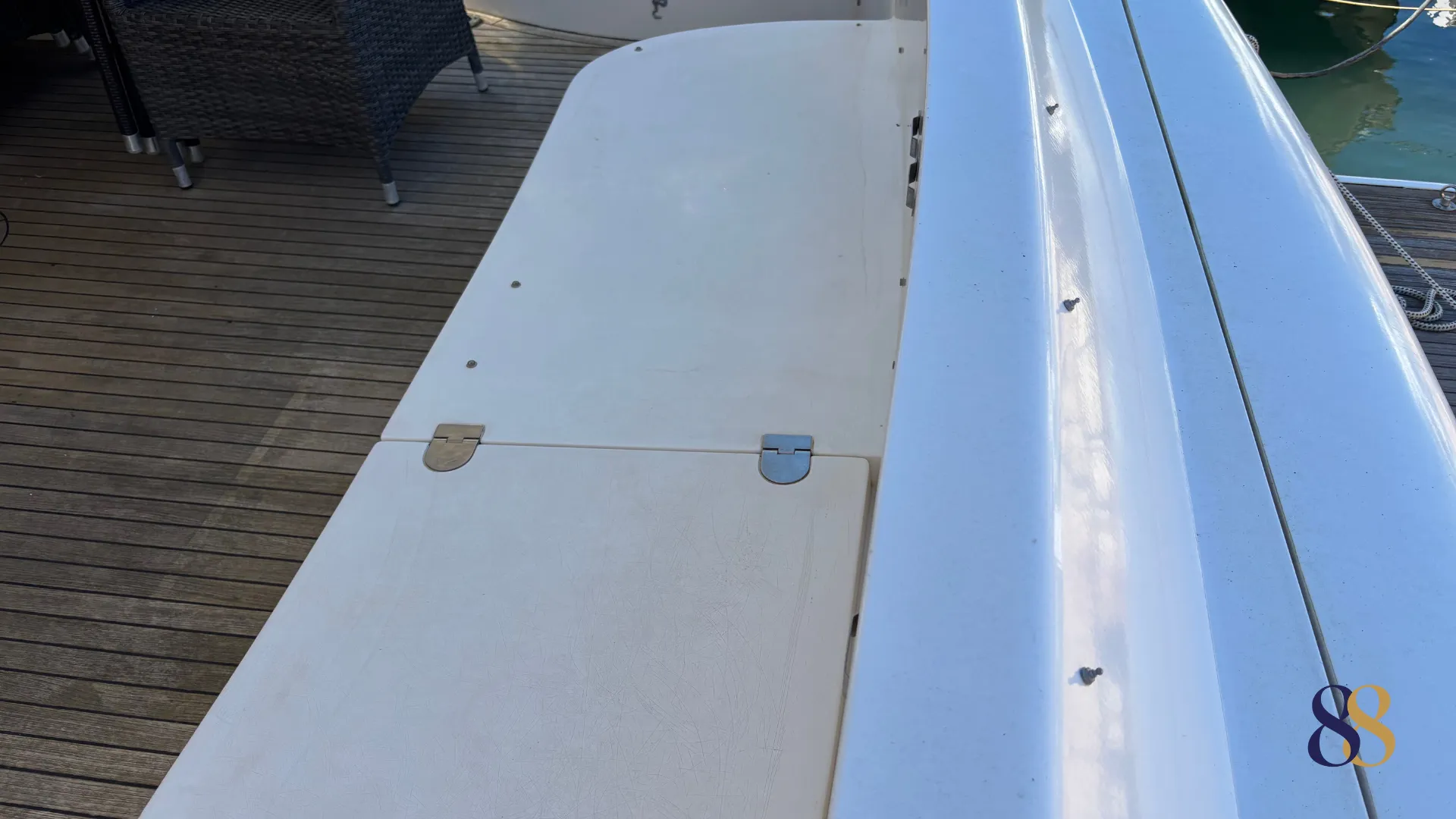 En cubierta, la bañera destaca por su comodidad y fácil acceso al mar gracias a la plataforma hidráulica, la pasarela eléctrica y la escalera de baño. El uso de teca en bañera y plataforma refuerza la sensación de yate clásico de alta gama, mientras que las lonas de fondeo protegen eficazmente todos los espacios exteriores.