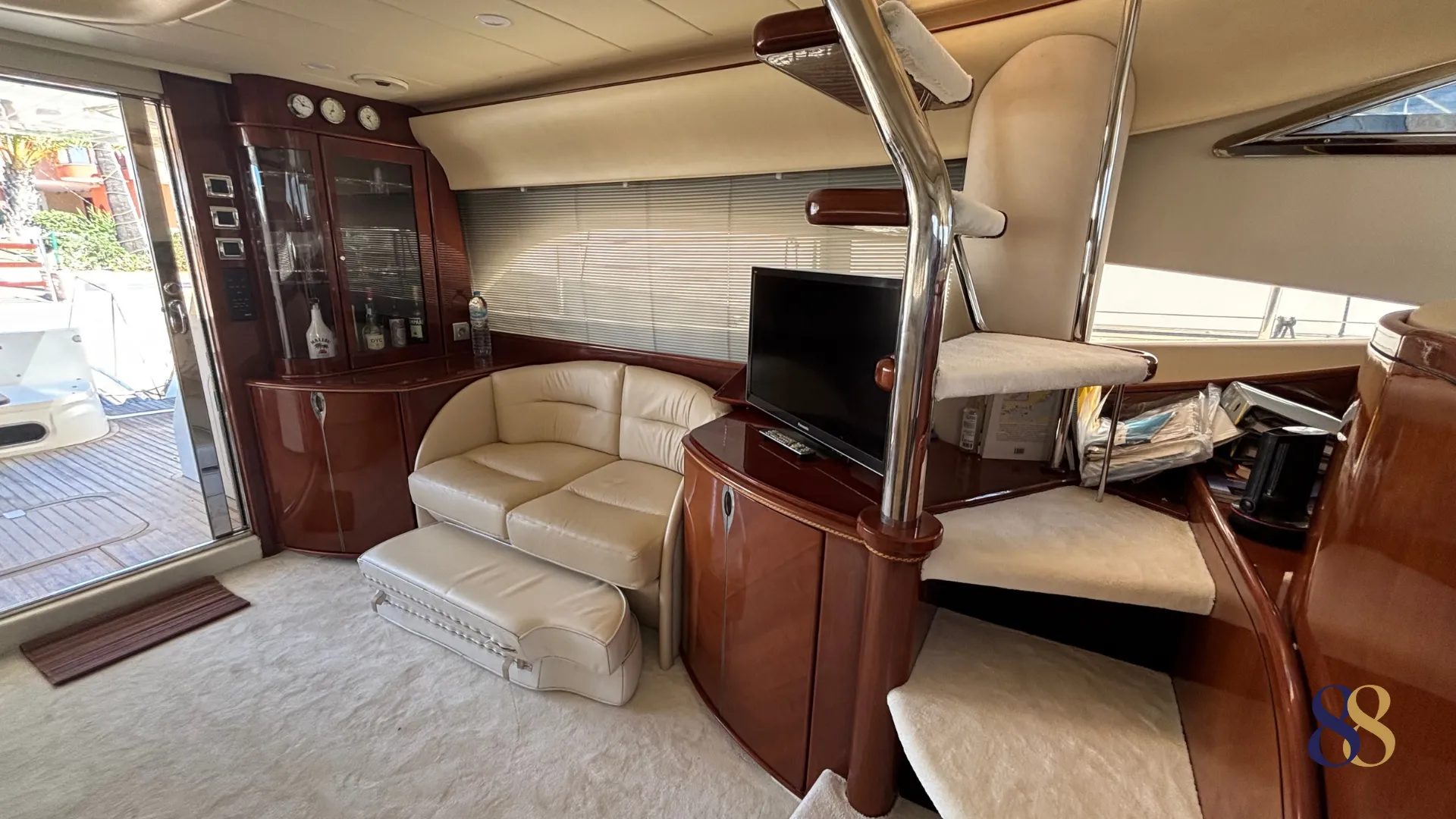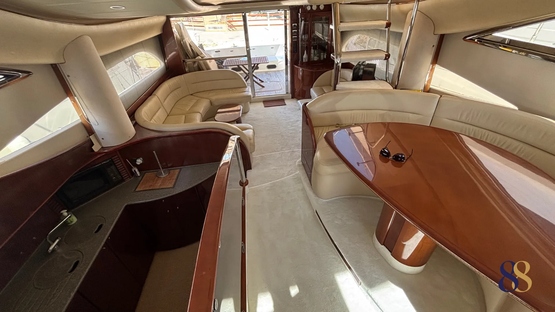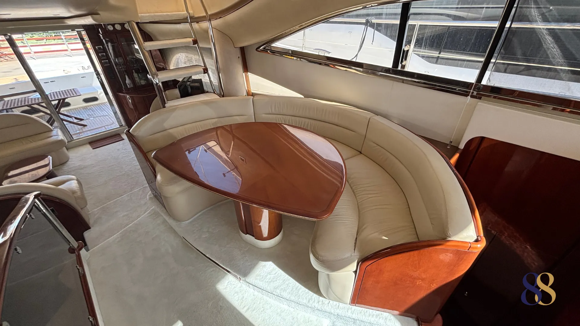 Al acceder al interior, el salón sorprende por su amplitud y luminosidad. Los grandes ventanales laterales permiten una generosa entrada de luz natural, reforzando la sensación de espacio y creando un ambiente elegante y acogedor. La distribución separa claramente la zona de descanso del área de comedor, ofreciendo una convivencia cómoda tanto en navegación como en puerto.