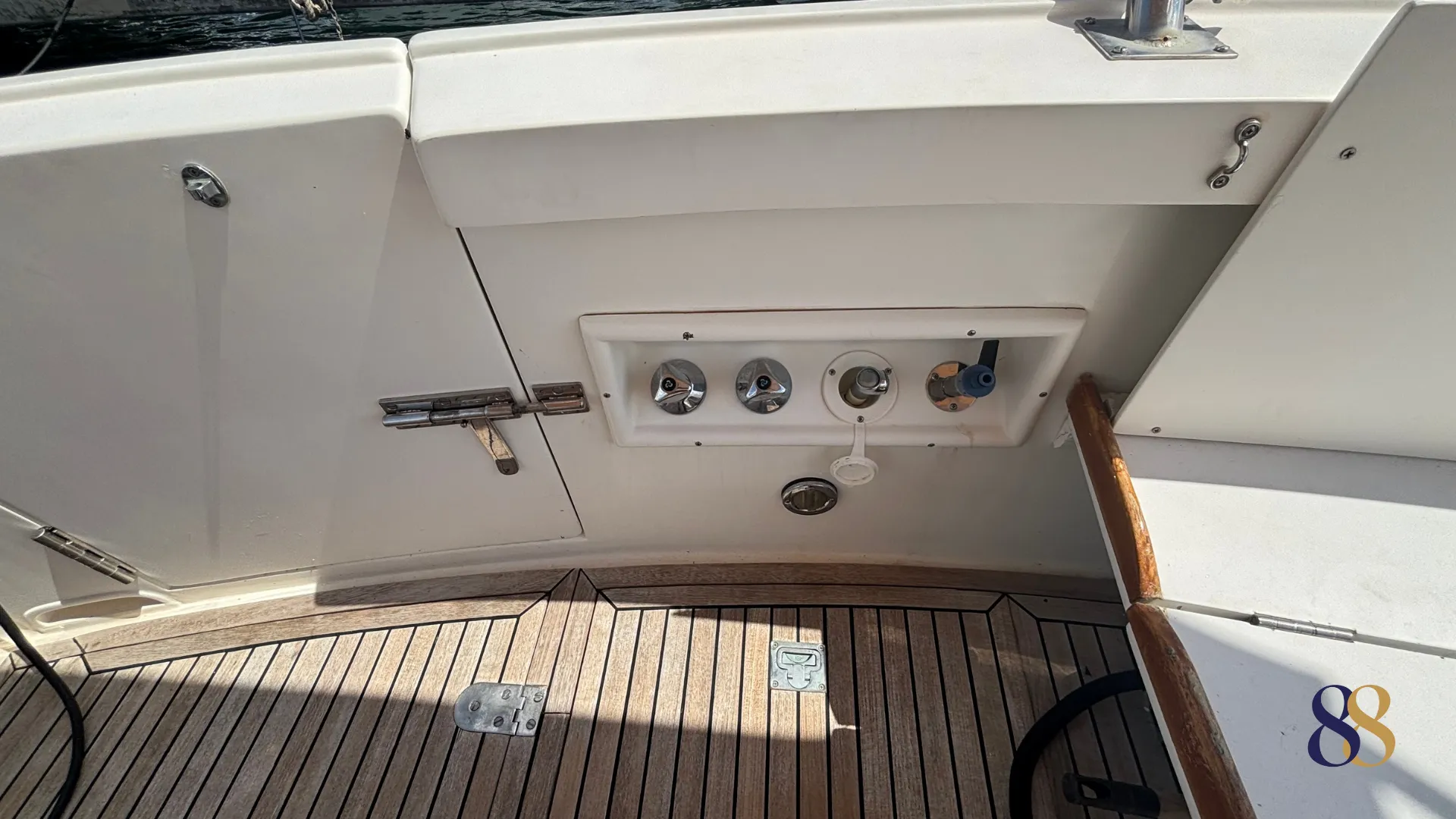 La bañera de popa, revestida en teca, está pensada para disfrutar tanto en navegación como fondeados, con mesa central, asientos cómodos y excelente circulación a bordo. La plataforma de baño, la escalera, la ducha exterior y la pasarela hidráulica refuerzan su enfoque práctico y confortable.